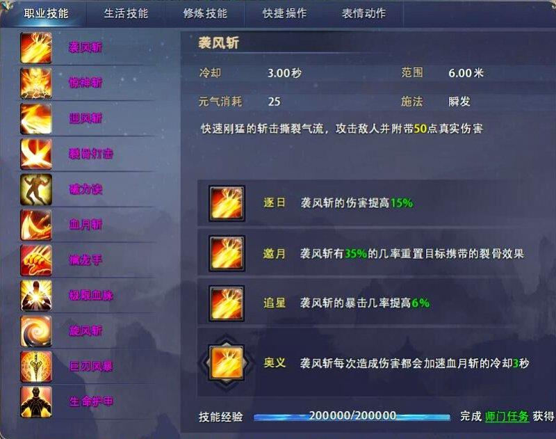 技能提升带来的是该技能延伸属性的增长或者对其他技能产生连带性的影响,以破军府的袭风斩技能为例,基础技能效果为对敌人造成50点伤害,而点亮了“奥义”效果,则会减少血月斩的冷却CD数。